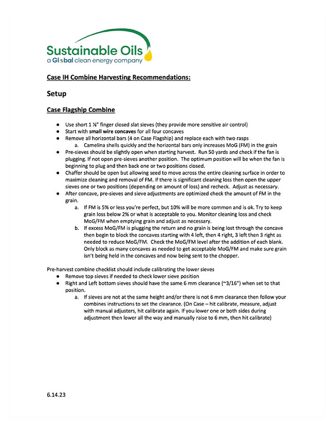 At Sustainable Oils we’re working with equipment manufacturers to ensure that you can achieve the best outcome with your crop. Attached is a guideline for adjusting CASE IH Flagship and smaller combines to maximize clean grain, harvest speed, and minimize foreign matter (MOG).