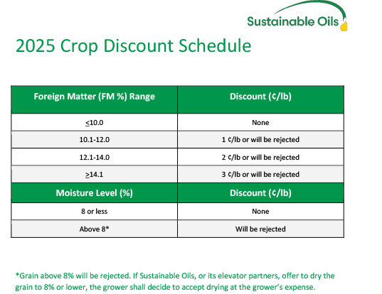 As indicated in the Sustainable Oils camelina production contract, below is the Incentive/Discount Schedule for all growers for 2025.